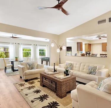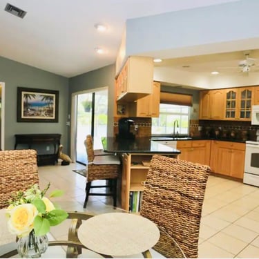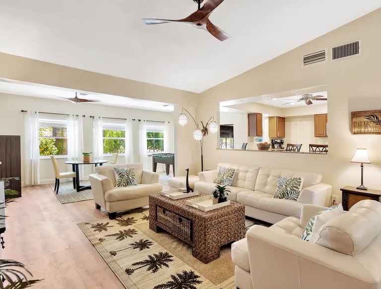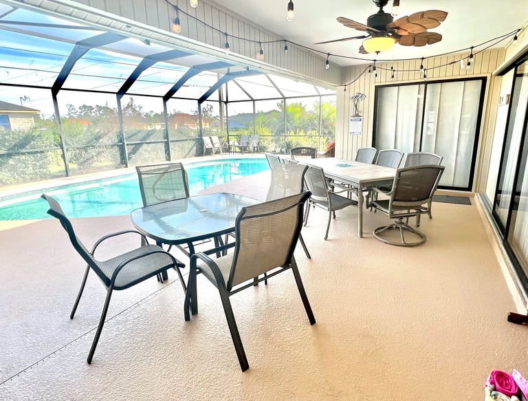 This spacious home sleeps up to 12 guests and is perfect for multiple families! Enjoy two living rooms, three bedrooms, two full bathrooms, a fully stocked eat-in kitchen, and plenty of space to relax. The large HEATED pool is available year-round at no extra charge and is surrounded by a covered pool cage and lanai, offering plenty of entertaining space. Conveniently located near shopping, restaurants, and just a 10–15-minute drive to the beaches.